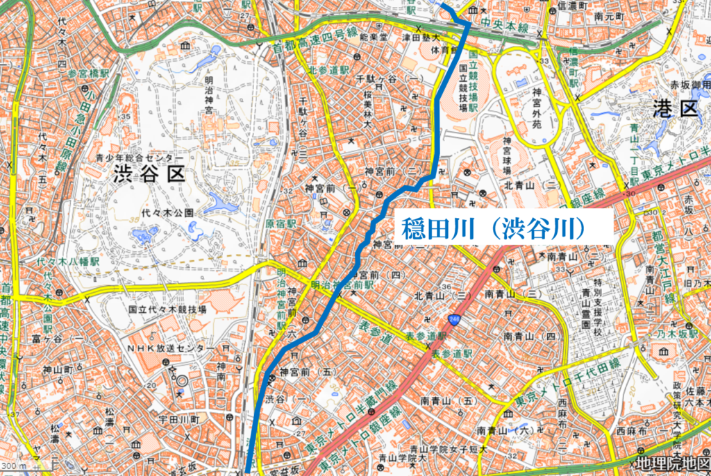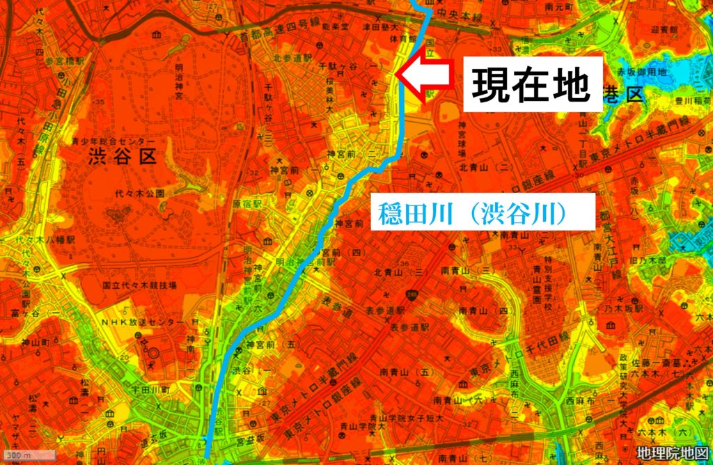 ここで再び今昔マップを見てみると丁度この場所に穏田川が流れていたことが分かりました。