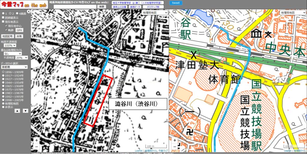 この場所を今と昔の地図と見比べるとこの場所に穏田川が流れていたことが分かりました。実は暗渠は区や市の境界になっていることも多いです。こういったところからもかつて川が流れていたことが分かるのは面白いですよね。