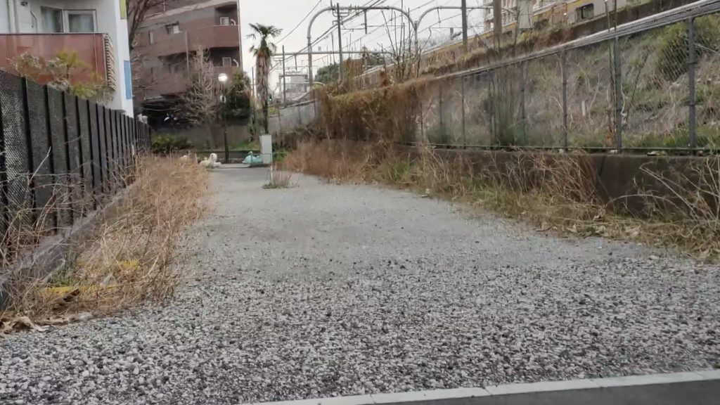 少し進むと砂利道が見えてきました。でも、なぜここに砂利道があるのでしょうか? 都心の駅近の土地なのですから、家か何か建てれば思ってしまいます。
