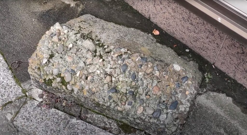 先に進むと、道の真ん中に縁石用のブロックが埋まっています。